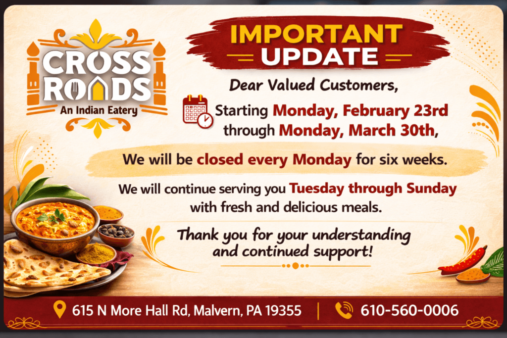 Posted on Shivesh SinghTrustindex verifies that the original source of the review is Google. Tried Tea, baby corn jalapeño and weekend special biryani. All of them were tasty. They have extensive menu and their service is also great. Loved their veg soya chap veg biryani . They r priced decently and quantity is also good. Definitely coming back to try more .Posted on SunilTrustindex verifies that the original source of the review is Google. Good food with real ingredients from India with tastePosted on Lax STrustindex verifies that the original source of the review is Google. Coming from Dallas, we enjoyed each and every dish we ordered. Veg Kheema Biryani is a must try. Jalapeno chicken and Jalapeno Baby Corn is awesome! And loved the Mango Delight desert as well. I do recommend this restaurant if you are in the Philly area and craving for Indian food.Posted on MrpTrustindex verifies that the original source of the review is Google. I recently placed a catering order from Cross Roads Malvern, and overall it was a good experience. The staff were helpful and attentive, and my order was prepared on time. The food was fresh, flavorful, and well-presented, making it perfect for our event. The ordering process was smooth, and pickup was convenient. I would recommend Cross Roads Malvern for catering needs, as they provide reliable service and quality food that makes any gathering enjoyable.Posted on Jada J.Trustindex verifies that the original source of the review is Google. Unfortunately this place is not GERD (Gastroesophageal Reflux Disease) friendly.. I ordered the “Malai Kofta”-MILD and it still was spicy. *sad face…Posted on Sridhar ATrustindex verifies that the original source of the review is Google. Food taste needs to be improved. Service also needs to be improved . Girl who was serving this afternoon was looking very serious with no smile at customers.